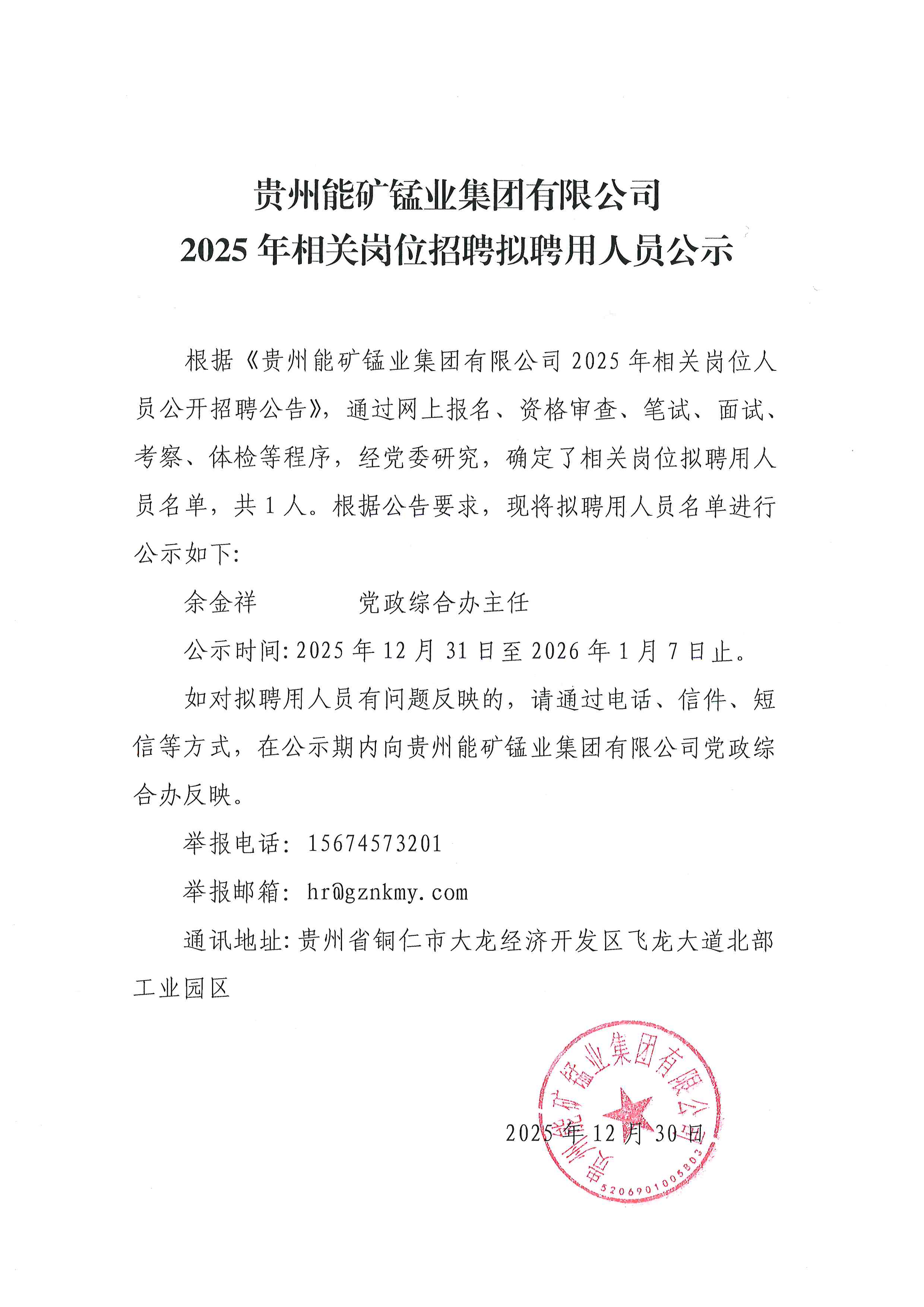 二、招聘岗位及工作地点根据工作需要,现面向社会公开招聘贵州能矿锰业集团有限公司品质管理部部长、党政综合办主任,共计2个岗位,现将相关事宜公告如下: